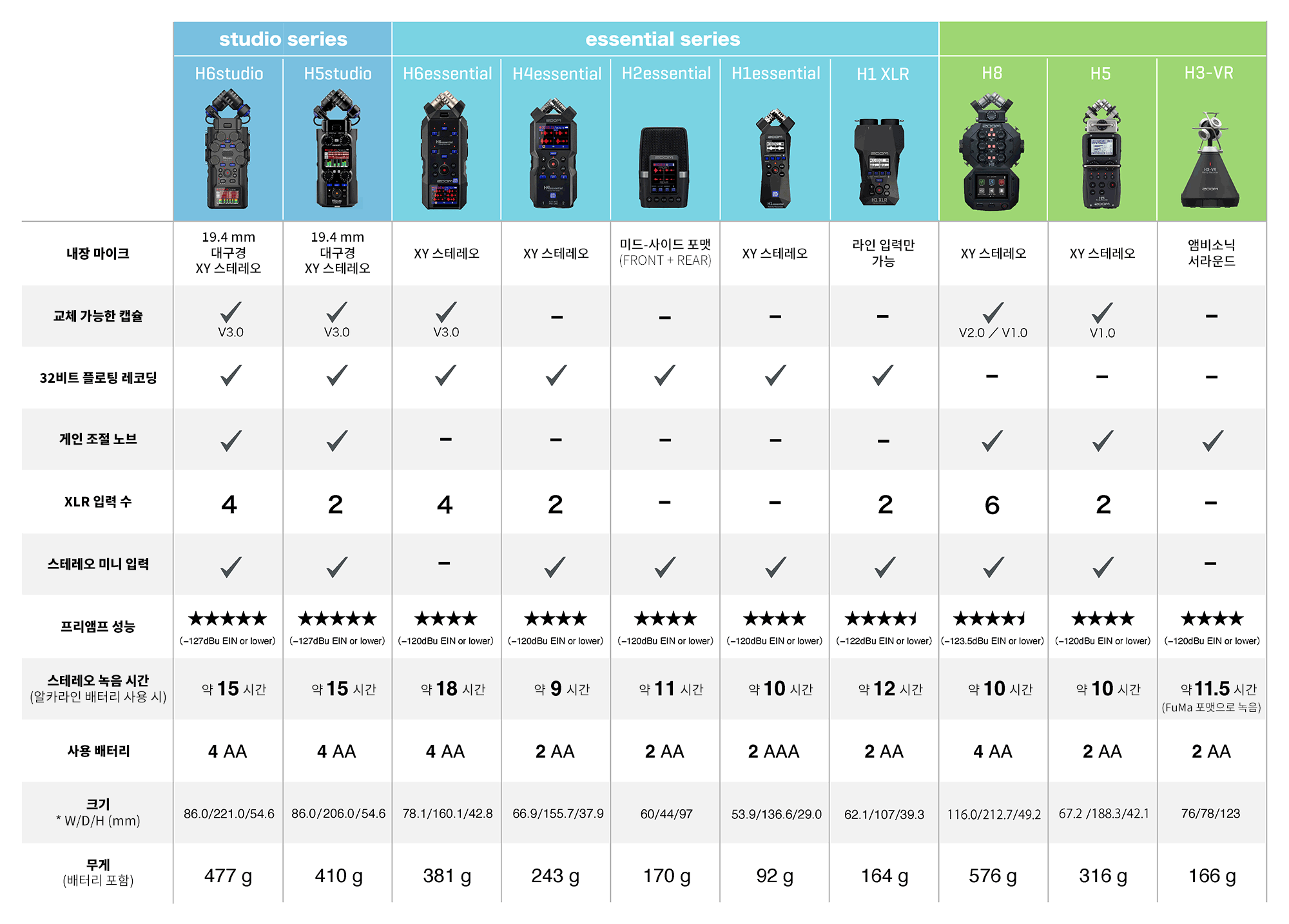 모델별로 내장 마이크의 종류, 32비트 플로트 녹음 지원 여부, 게인 노브 탑재 여부, XLR 입력 단자의 수와 기타 기능들을 고려해 보실 수 있습니다.